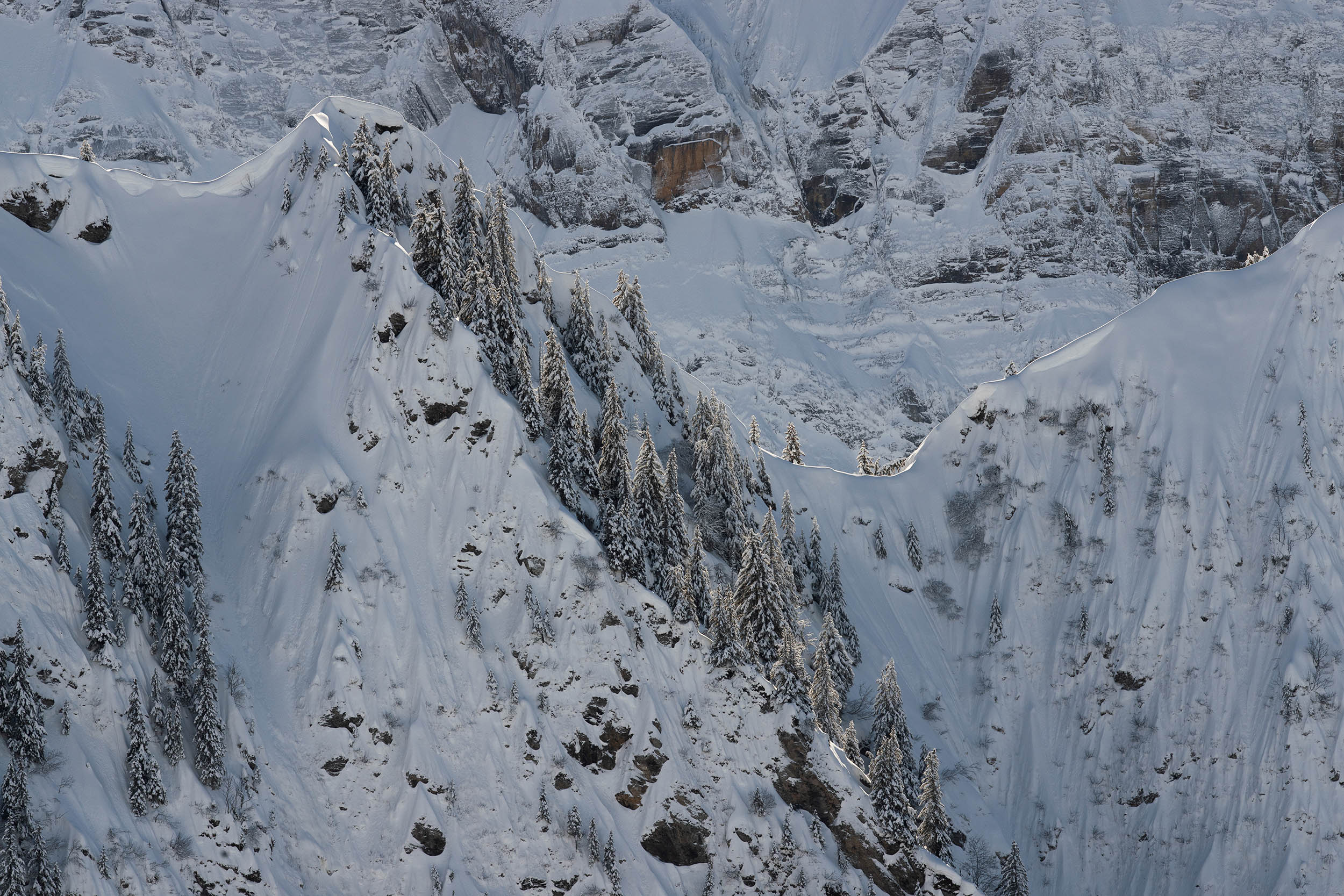 Plutôt que de chercher les grands paysages, j’ai beaucoup utilisé le téléobjectif pour isoler ces textures à distance : fragments de pentes, reliefs comprimés par la lumière, lignes tendues dans la neige.